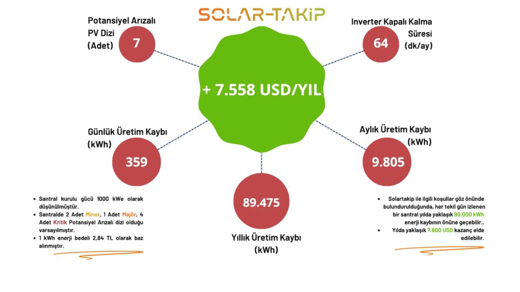 1000 kWe kurulu güce sahip bir tesisin yaklaşık 130 adet PV serisinden sadece 7 adetinin potansiyel arızalı olmasından kaynaklı yılda 7.558 USD kaybın olacağı belirtilmektedir.